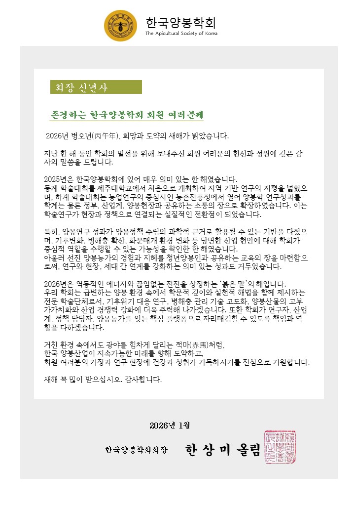 2026년 제42차 한국양봉학회 정기총회 및 동계학술대회 개최