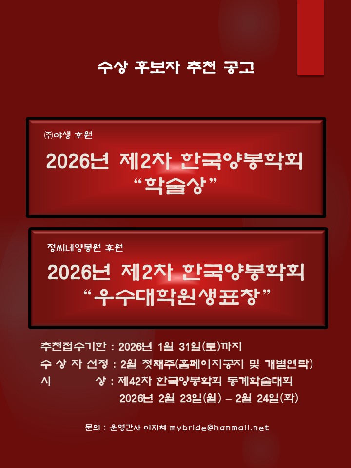 2026년 제2회 한국양봉학회 "학술상" 후보자 추천 안내(기한:2026년 1월 31일까지)