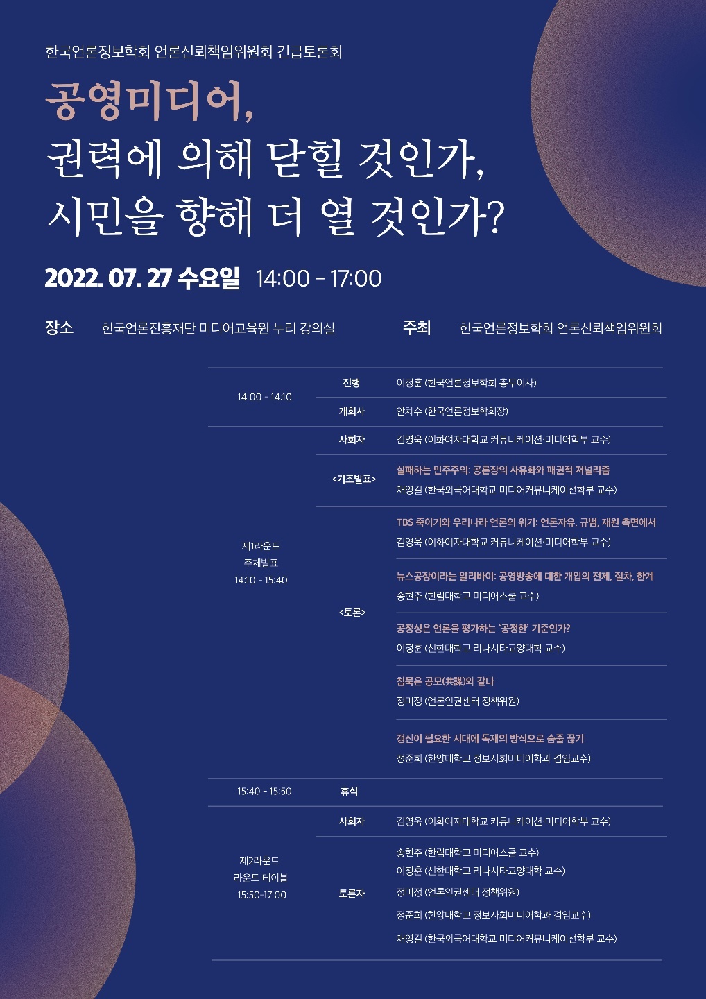 한국언론정보학회 긴급토론회 <공영미디어, 권력에 의해 닫힐 것인가, 시민을 향해 더 열 것인가?> 개최 안내