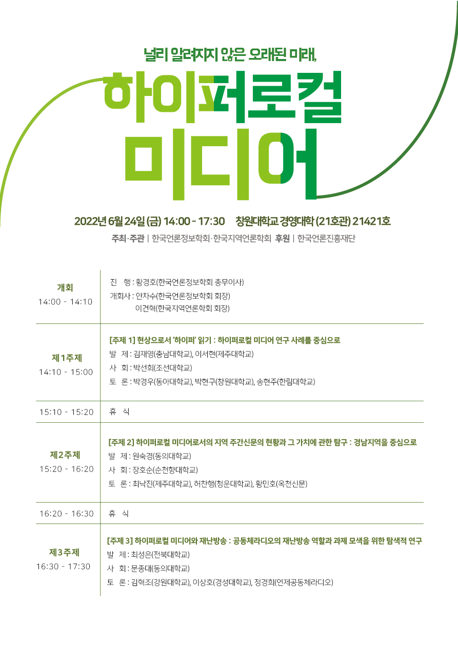 2. 한국언론정보학회는 한국지역언론학회와의 공동 학술세미나 <널리 알려지지 않은 오래된 미래, 하이퍼로컬 미디어>를 다음과 같이 개최합니다. 회원 여러분의 많은 관심과 참여를 부탁드립니다. 감사합니다.