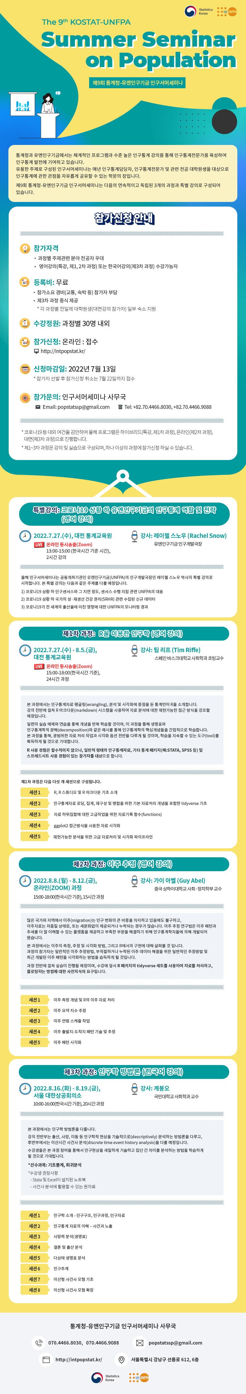 2022년 인구서머세미나는 연속적이고 독립적인 세 개의 과정, 'R을 이용한 인구학', '이주 추정', '인구학 방법론'과 '코로나19 상황 하 유엔인구기금의 인구통계 역할 및 전략'을 주제로 한 특별 강의로 구성되어 있으며, 코로나19 등 대외 여건을 감안하여 하이브리드(특강, 제1차), 온라인(제2차), 대면(제3차)강의로 진행합니다.