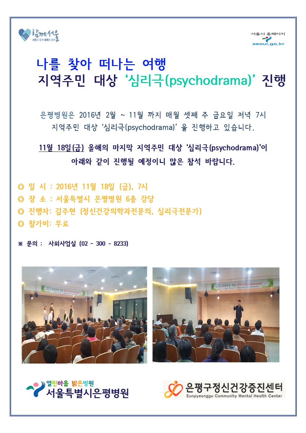 [은평병원] 11월 18일 지역주민 및 일반인 대상 심리극 진행 안내드립니다