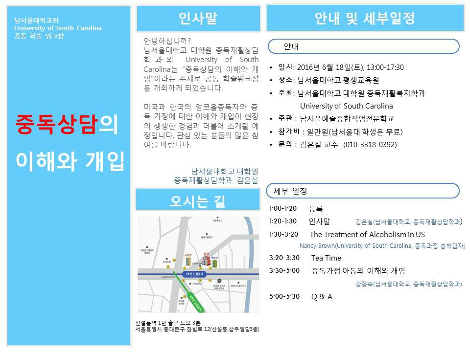 남서울대학교 대학원 중독재활상담학과와 Uiverity of South Carolina는 '중독상담의 이해와 개입'이라는 주제로 공동 학술워크샵을 개최하게 되었습니다. 미국과 한국의 알코올중독자와 중독 가정에 대한 이해와 개입이 현장의 생생한 경험과 더불어 소개될 예정입니다.