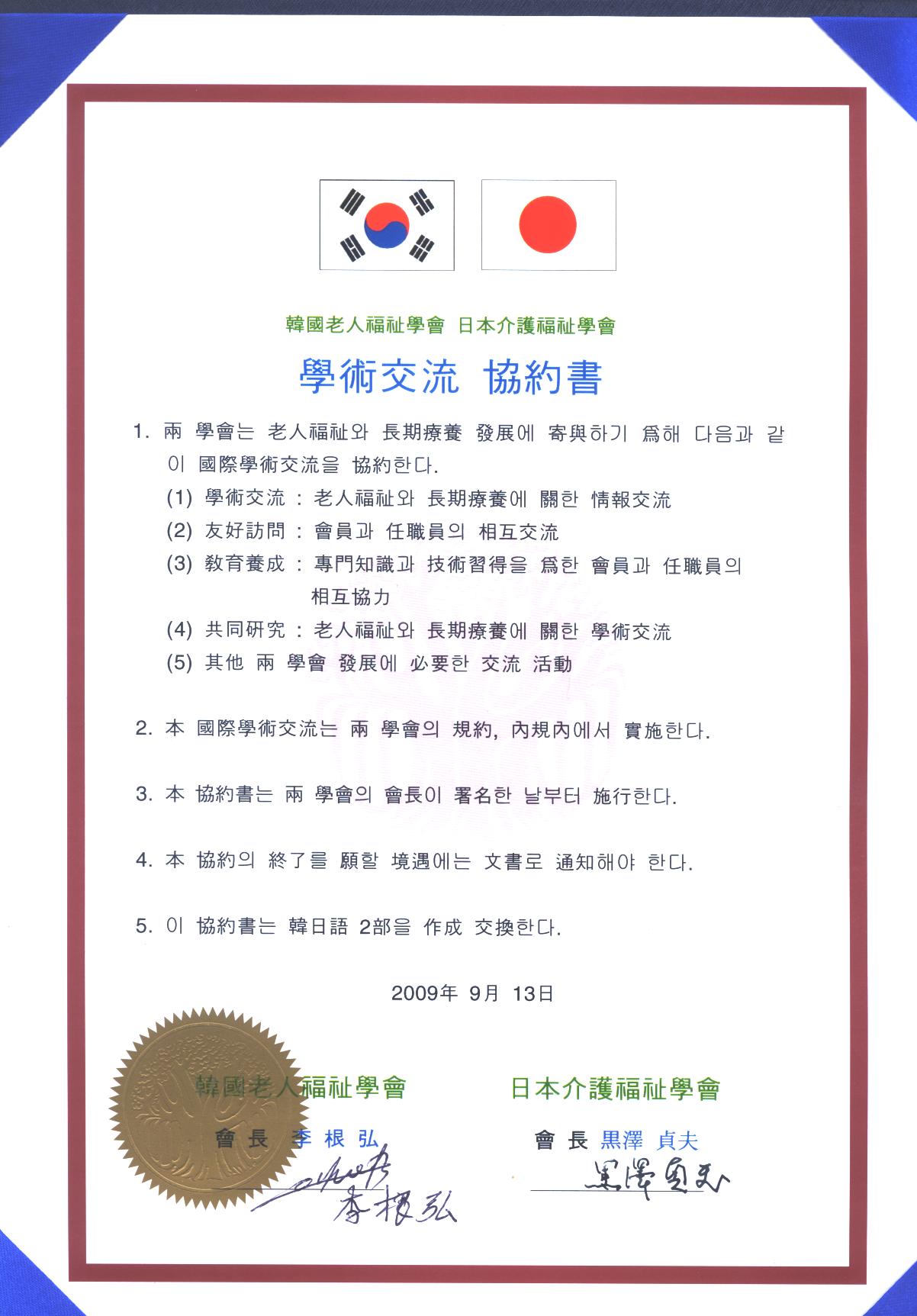 日本介護福祉學會(會長 : 黑澤貞夫)와 우리 학회가 양국의 노인복지 발전에 기여할 수 있도록 2009년 9월 13일 일본 동경에서 두 학회간의 학술교류, 우호방문, 교육양성, 공동연구 등을 위한 협정을 체결하였다. 日本介護福祉學會와의 학술교류협정은 우리 학회의 발전과 회원들의 학문연구에 크게 기여할 수 있는 계기가 될 것이다.(*첨부파일-학술교류협정 사진 참조)