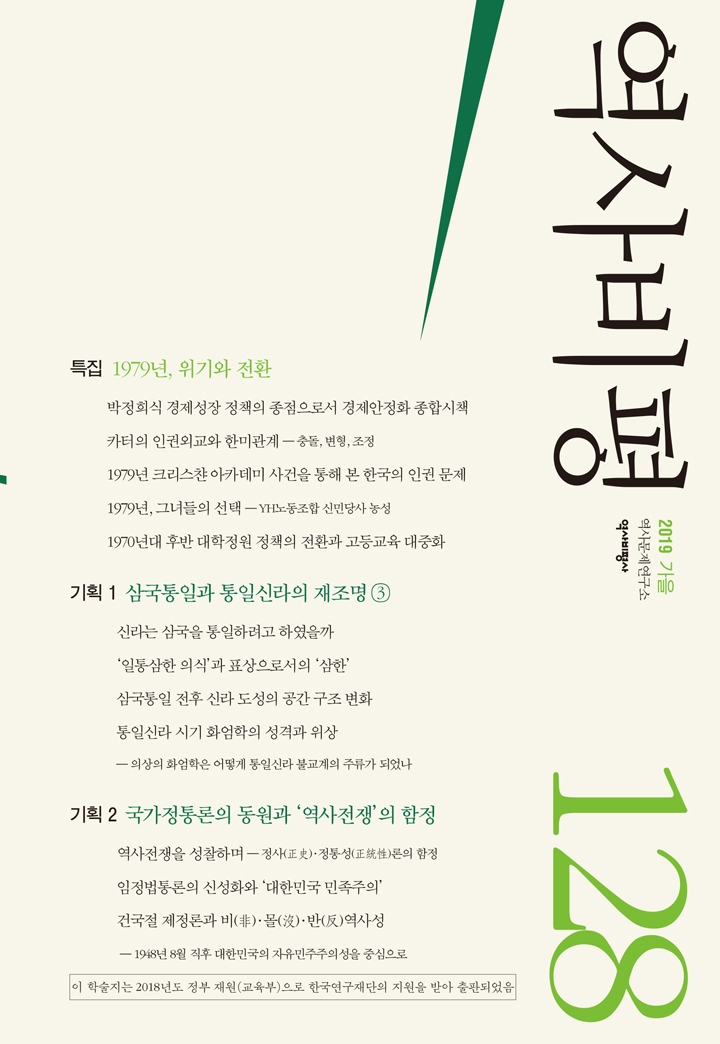 지난 126호부터 시작된《삼국통일과 통일신라의 재조명》기획은 3회차를 맞아 네 편의 논문을 실었다. 전덕재는 신라의 삼국통일 과정에서 신라의 주도성이 분명히 존재했고 통일전쟁의 결과 오늘날 한국 민족의 원형이 만들어진 까닭에, ‘백제병합전쟁’이나 ‘7세기 중·후반 동북아시아 전쟁’보다는 ‘삼국통일(통합)전쟁’이 여전히 가장 합리적인 명칭이라고 강조했다. 기경량은 신라인들이 주장한 ‘일통삼한’ 개념에서 ‘삼한’은 7세기 초 수와 당이 고구려를 침공하는 과정에서 창출한 표상으로서의 공간 개념이었는데, 이 가운데 옛 고구려의 수도인 평양 지역이야말로 ‘삼한’ 개념의 핵심 지역이었다고 보았다. 따라서 전쟁 직후인 7세기 말에 보이는 신라의 ‘일통삼한’의식은 백제와 고구려 지역을 아우르는 일통 의식으로 볼 수 있다는 것이다. 두 논문은 삼국통일에서 신라의 주도성을 강조하는 전통적인 관점의 연속선상에 있는 만큼, 다른 입장을 가진 연구자들의 반론이 계속되기를 기대한다. 한편 여호규는 삼국통일을 전후한 시기 신라 도성의 공간구조 변화를 검토하고, 신라 도성이 당 장안성을 모델로 삼으면서도 통일 이전의 도성 조영 전통을 계승했음을 강조했다. 여호규의 이러한 입장은 중고기 이래 형성되었던 신라 전통의 지배 체제가 삼국통일 이후에 더욱 공고해졌다는 지난호 기획 논문들과 인식상의 공통점을 갖고 있다. 마지막으로 최연식은 의상의 화엄학이 8세기 중반 이후에야 주류적 위상을 차지하고, 선종이 유행하는 9세기 후반 이후에도 그 영향력을 꾸준히 유지했음을 치밀하게 논증했다.