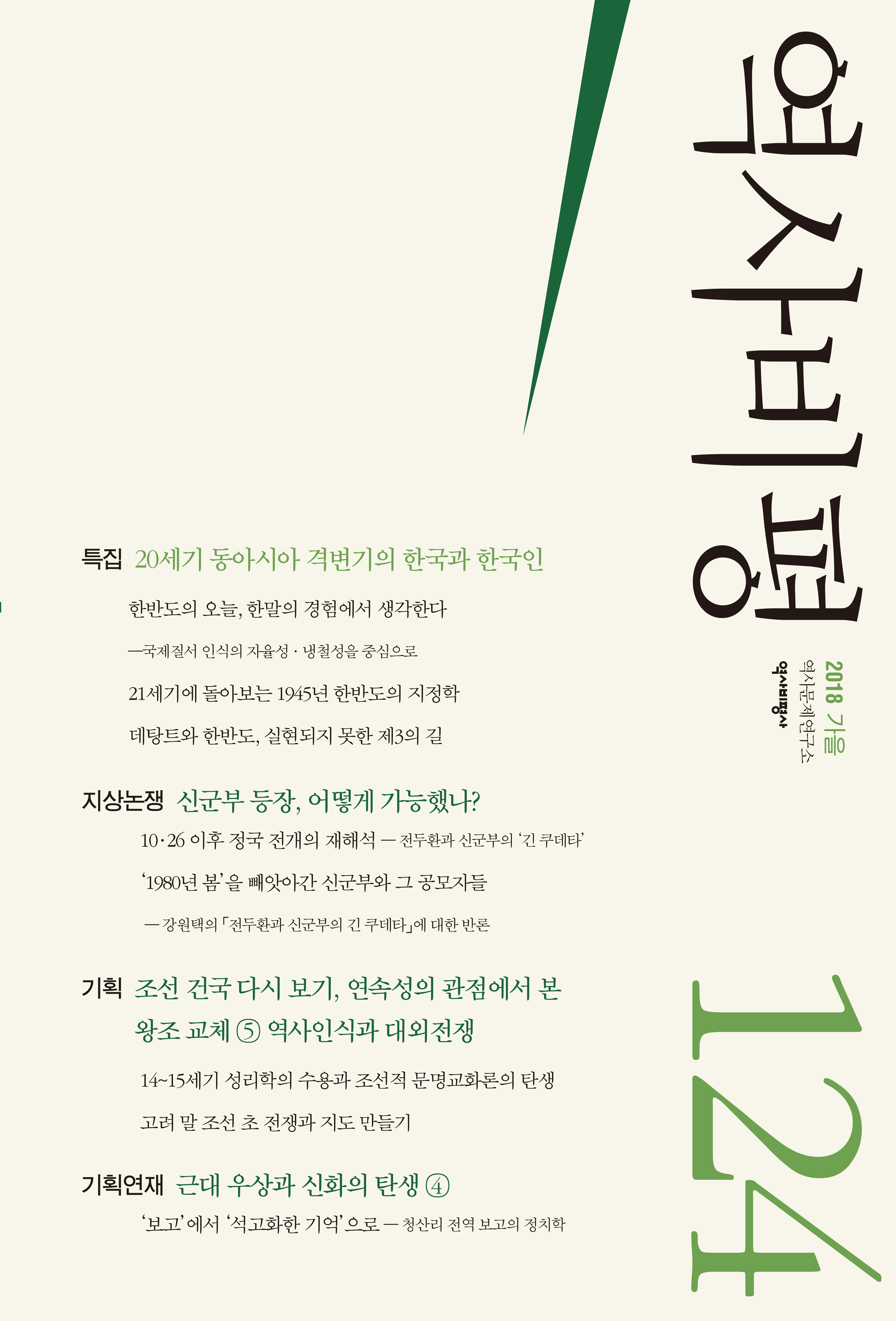 이번 『역사비평』 가을호의 특집 ‘20세기 동아시아 격변기의 한국과 한국인’은 최근 전개되고 있는 한반도 주변의 급속한 정세 변화를 역사 속의 유사한 사례들에 대한 기억을 통해 분석하고 전망하기 위해 마련되었다. 지난 100여 년 동안 한반도와 그 주변에는 몇 차례 큰 정세 변동이 있었다. 『역사비평』은 그중 일본의 한반도 식민지화로 귀결된 19세기 말과 20세기 초, 제2차 세계대전의 종전과 함께 한반도의 해방과 분단이 전개된 1945년, 데탕트라는 동서냉전의 완화 속에서 유신독재가 출현한 1970년대를 집중 조명했다. 19세기 말과 20세기 초를 다룬 배항섭은, 당시 지식인과 언론들이 보인 정세인식의 대외의존성을 비판하면서 현재 한반도를 둘러싸고 전개되는 변화의 흐름과 의미를 현명하게 포착해내고 변화에 적극적으로 개입할 수 있는 여지를 확보해야 한다고 주장한다. 1945년을 다룬 김성보는, 종전 당시 미국과 소련 등 연합국이 동북아시아에서 한반도가 차지하는 지정학적 위치를 우선적으로 고려했음에도, 당시 한국의 정치 세력들은 급변하는 국제정세를 읽어내고 대처해 나가는 지정학적 안목이 부족하여 분단이 고착되었다고 비판한다. 1970년대를 다룬 박태균은, 데탕트가 한반도 평화체제 전환의 기회였지만 유신체제하에서 사회적 논의와 공감대 자체가 완전히 봉쇄된 상태에서 한국이 세계사적 흐름을 타지 못했음을 지적한다. 그리고 정부와 시민사회의 대응 여하에 따라 국제적인 정세 변화가 기회가 될 수도 있고 위기가 될 수도 있음을 역설한다. 이 세 편의 특집 논문들은 모두 외부 정세 변화에 대한 냉철한 인식과 능동적인 내부 대응의 필요성을 강조하는 공통점을 보였다.