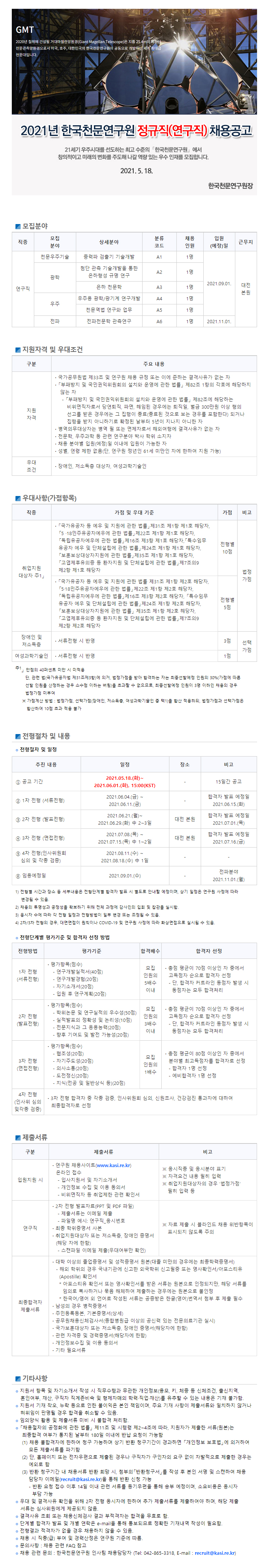 1. 채용내용 : 2021년 한국천문연구원 정규직(연구직) 채용공고