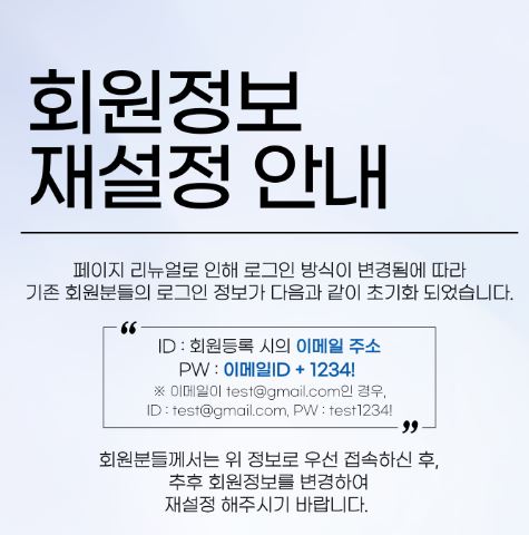 회원분들께서는 위 정보로 우선 접속하시 후, 추후 회원정보를 변경하여 재설정 해 주시기 바랍니다.