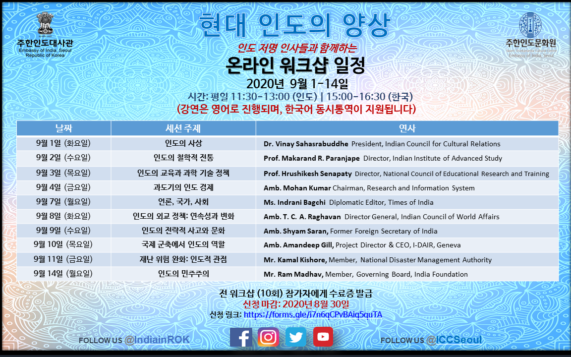 주한인도문화원이 '현대 인도의 양상(Facets of Modern India)'이라는 주제 아래 개최하는 온라인 워크샵 소식을 전달드립니다.