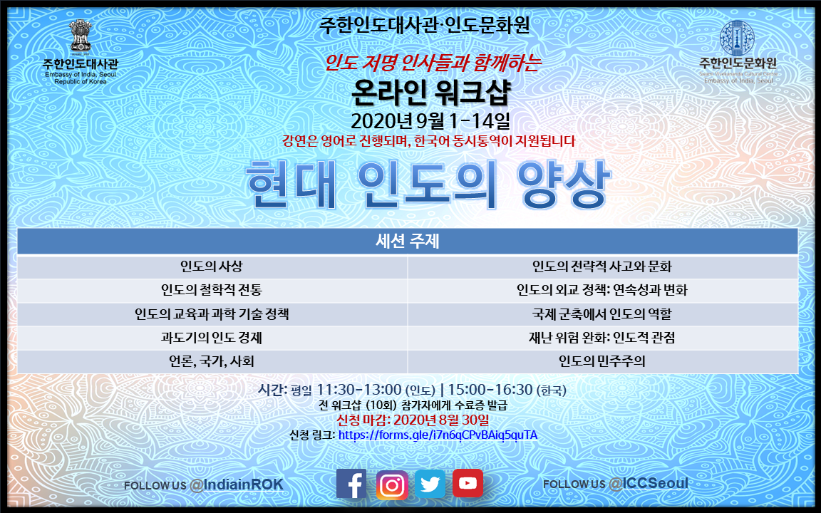 [주한인도문화원] '현대 인도의 양상' 온라인 워크샵 안내