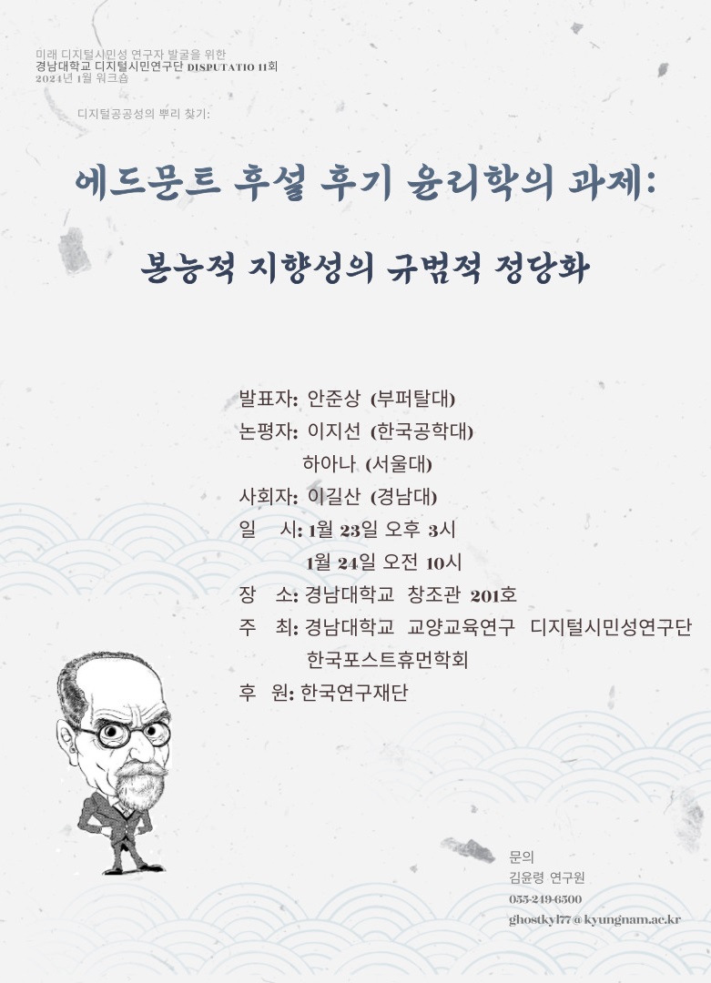본 연구소는 <디지털시민성 함양을 위한 지역형 인문교양교육 모형 개발 및 확산>이라는 주제로 2021년도 『인문사회연구소지원사업』에 선정된 바 있습니다. 해당 연구사업의 한 꼭지로 설계된 이 Disputatio는 미래의 디지털시민성 담론을 주도할 신진연구자 발굴을 목표로 합니다. 본 연구단의 핵심 물음인 ‘디지털시민성 함양’을 향해, 기초학문분야에서 연구역량이 매우 기대되는 박사과정생이나 혹은 최근에 박사학위를 취득하신 분들이 던져줄 짜릿한 지적 자극을 한껏 기대해봅니다.