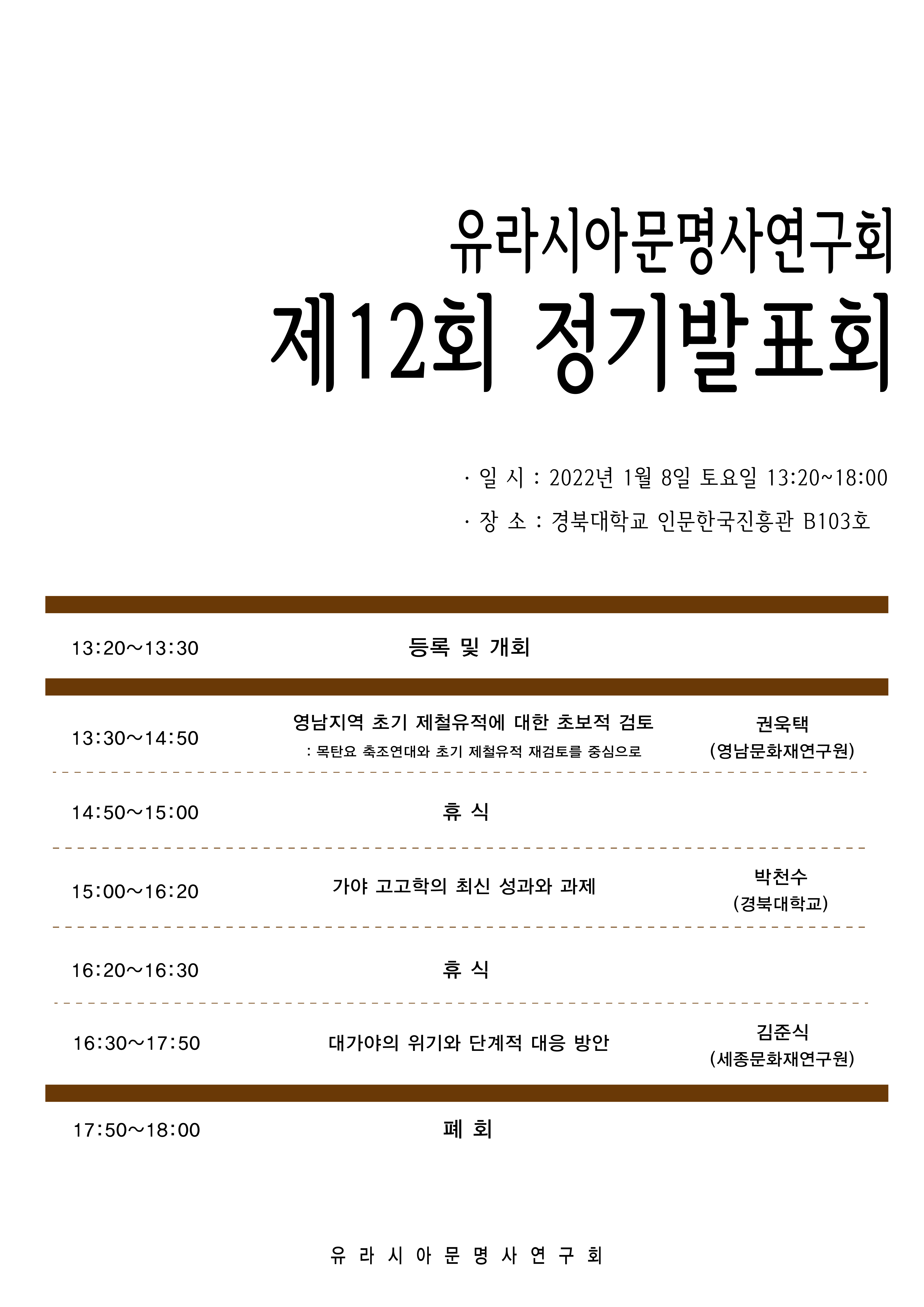 2022년 1월 8일 토요일, 〈유라시아문명사연구회 제12회 정기발표회〉를 개최하고자 합니다. 여러분의 많은 관심과 참여 부탁드립니다.