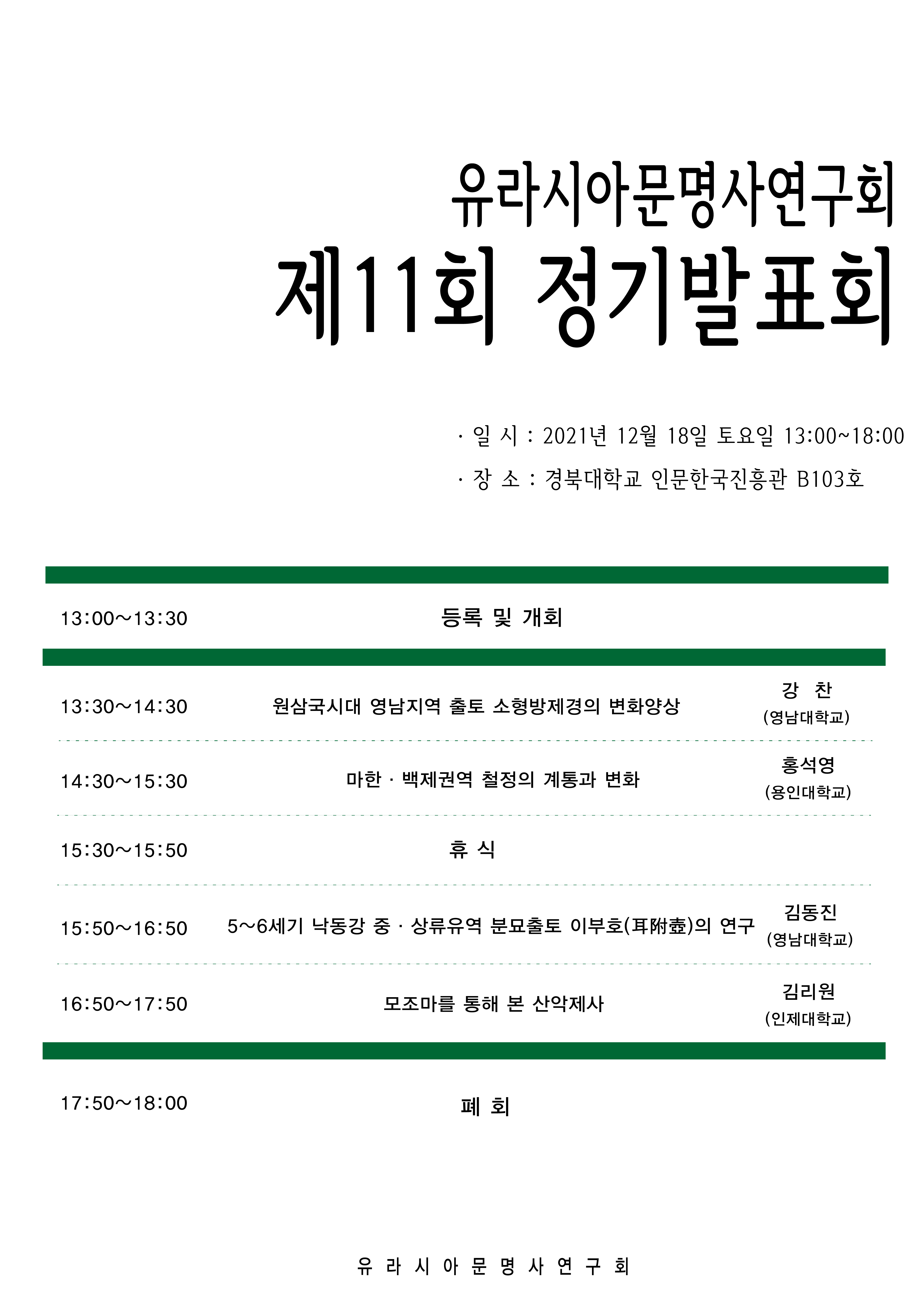 2021년 12월 18일 토요일, 〈유라시아문명사연구회 제11회 정기발표회〉를 개최하고자 합니다. 여러분의 많은 관심과 참여 부탁드립니다.