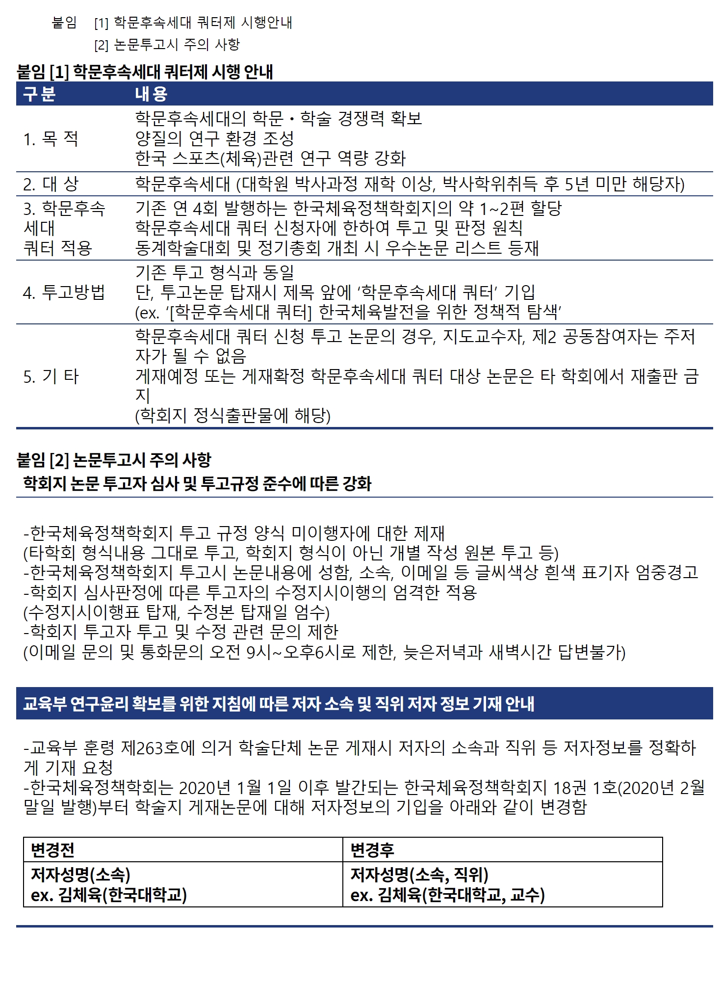 3. 한국체육정책학회지 17권 4호부터 학문후속세대 학문ㆍ학술 경쟁력 확보를 위한 학문후속세대 쿼터제를 시행하오니 참고하시어 회원님들의 적극적인 관심과 논문 투고 부탁드립니다.
