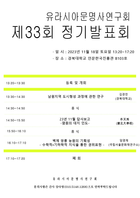 2023년 11월 18일 토요일, 유라시아문명사연구회 제33회 정기발표회가 진행될 예정입니다.