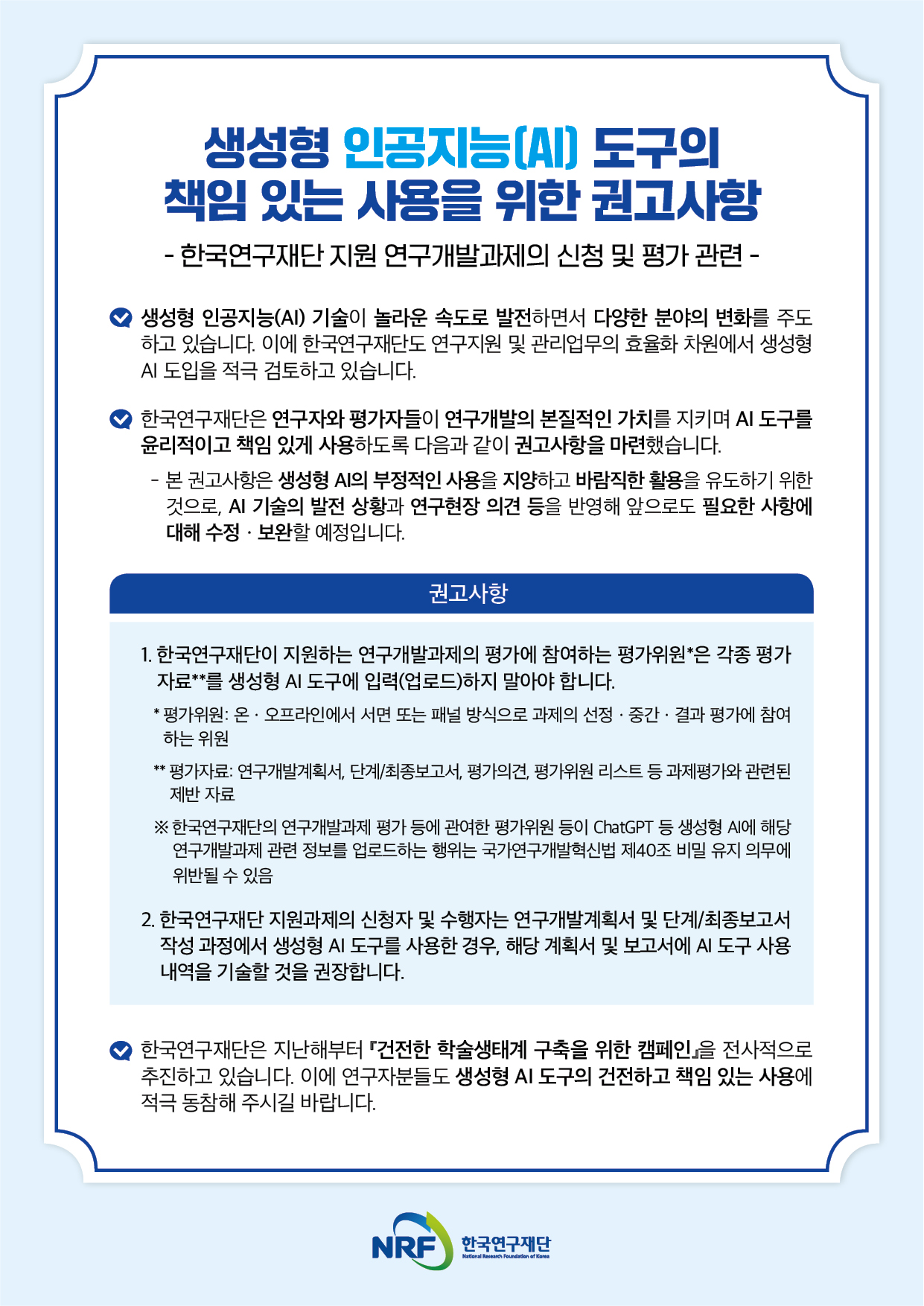 [연구재단] 생성형 인공지능(AI) 도구의 책임 있는 사용을 위한 권고사항 안내