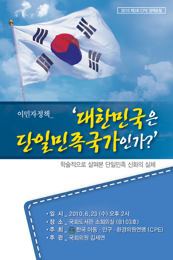 [2010년 제3회 CPE 정책포럼]대한민국은 단일민족국가인가? 학술적으로 살펴본 단일민족 신화의 실체 ■ 일시 : 2010년 6월 23일(수), 14:00 ~ 16:30 ■ 장소 : 국회도서관 소회의실