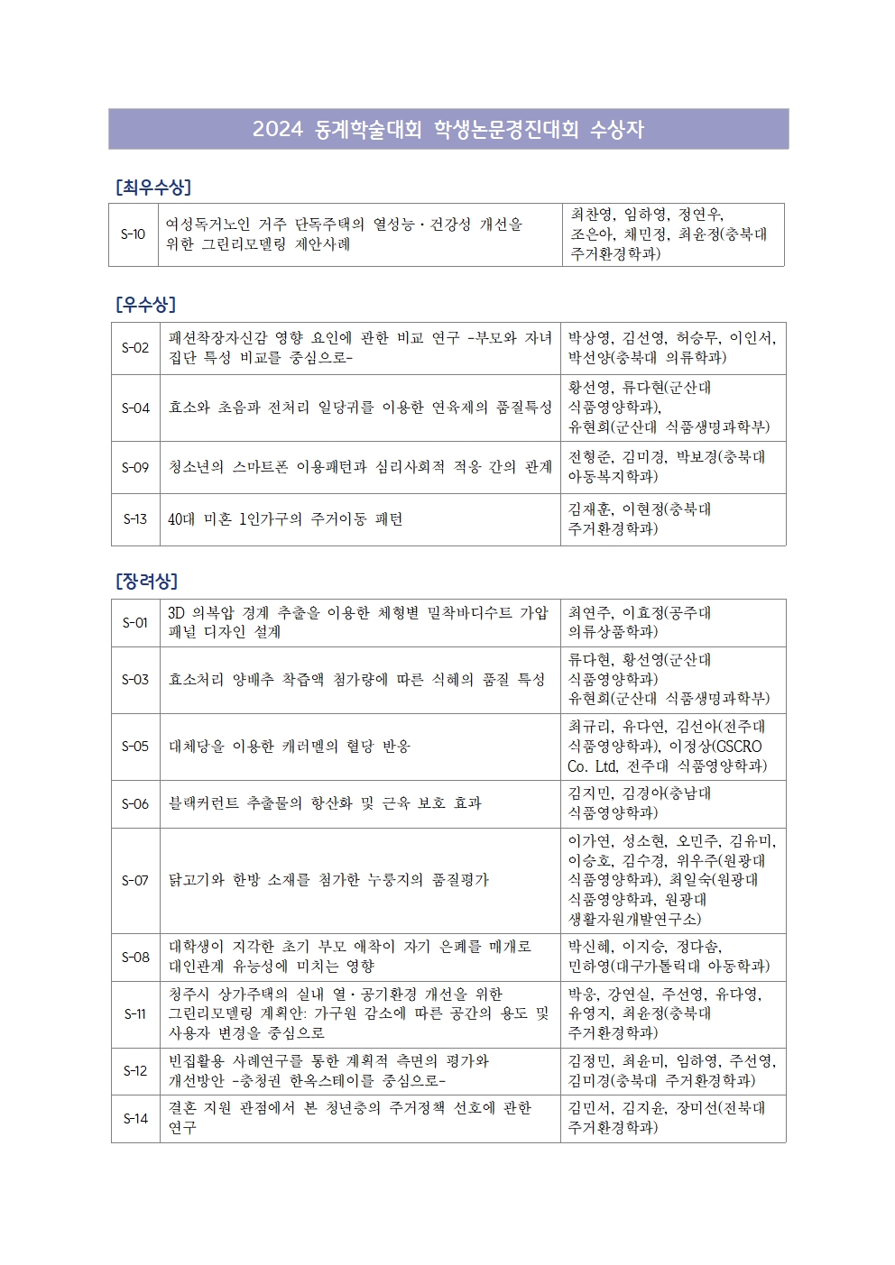 [한국생활과학회] 2024동계학술대회 학생논문경진대회 수상자 명단