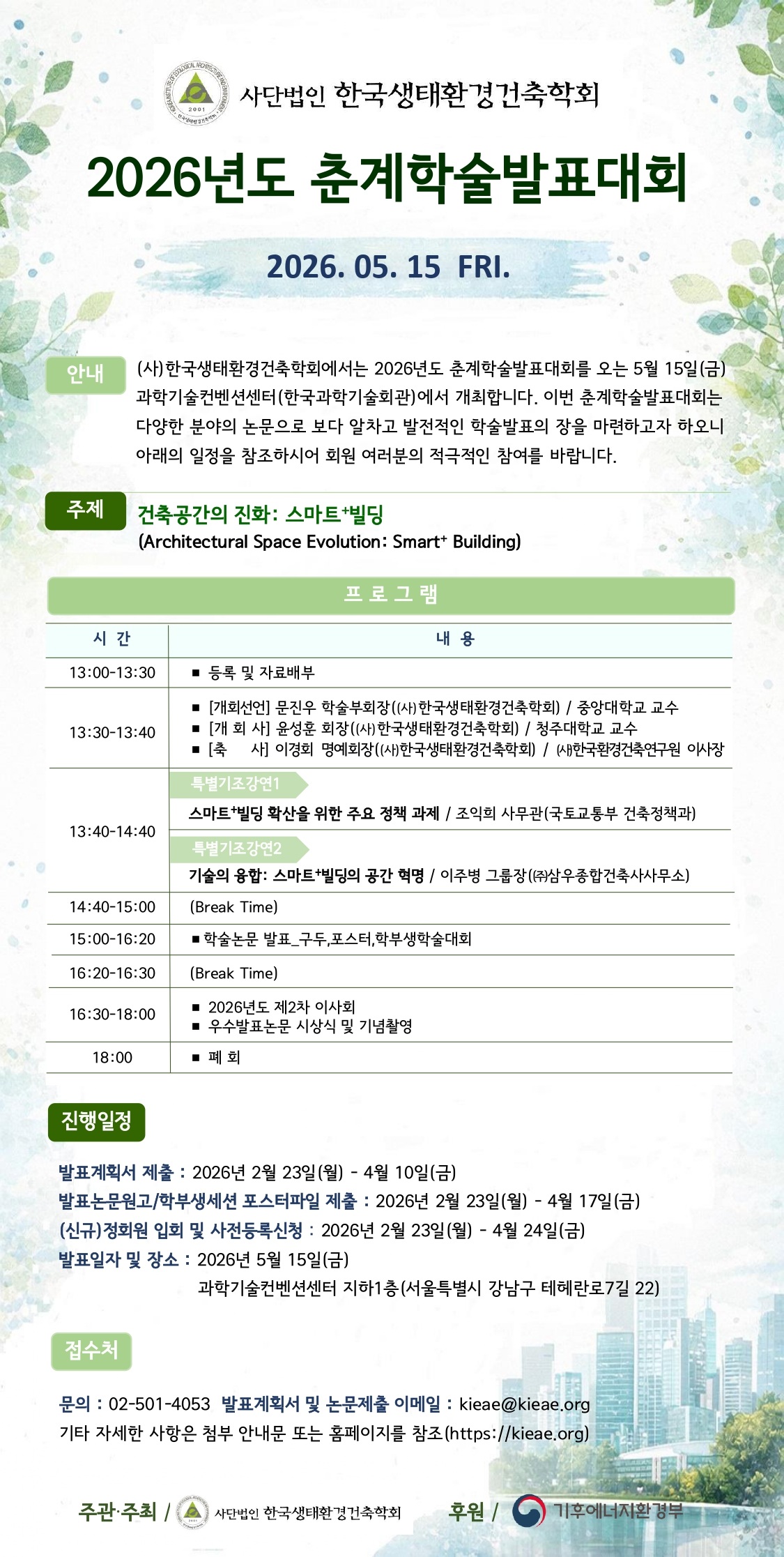 (사)한국생태환경건축학회에서는 2026년도 춘계학술발표대회를 오는 5월 15일(금) 과학기술컨벤션센터(한국과학기술회관)에서 개최합니다.  이번 춘계학술발표대회는 다양한 분야의 논문으로 보다 알차고 발전적인 학술발표의 장을 마련하고자 하오니 아래의 발표논문분야와 일정을 참고하시어 회원 여러분의 적극적인 참여를 부탁드립니다.