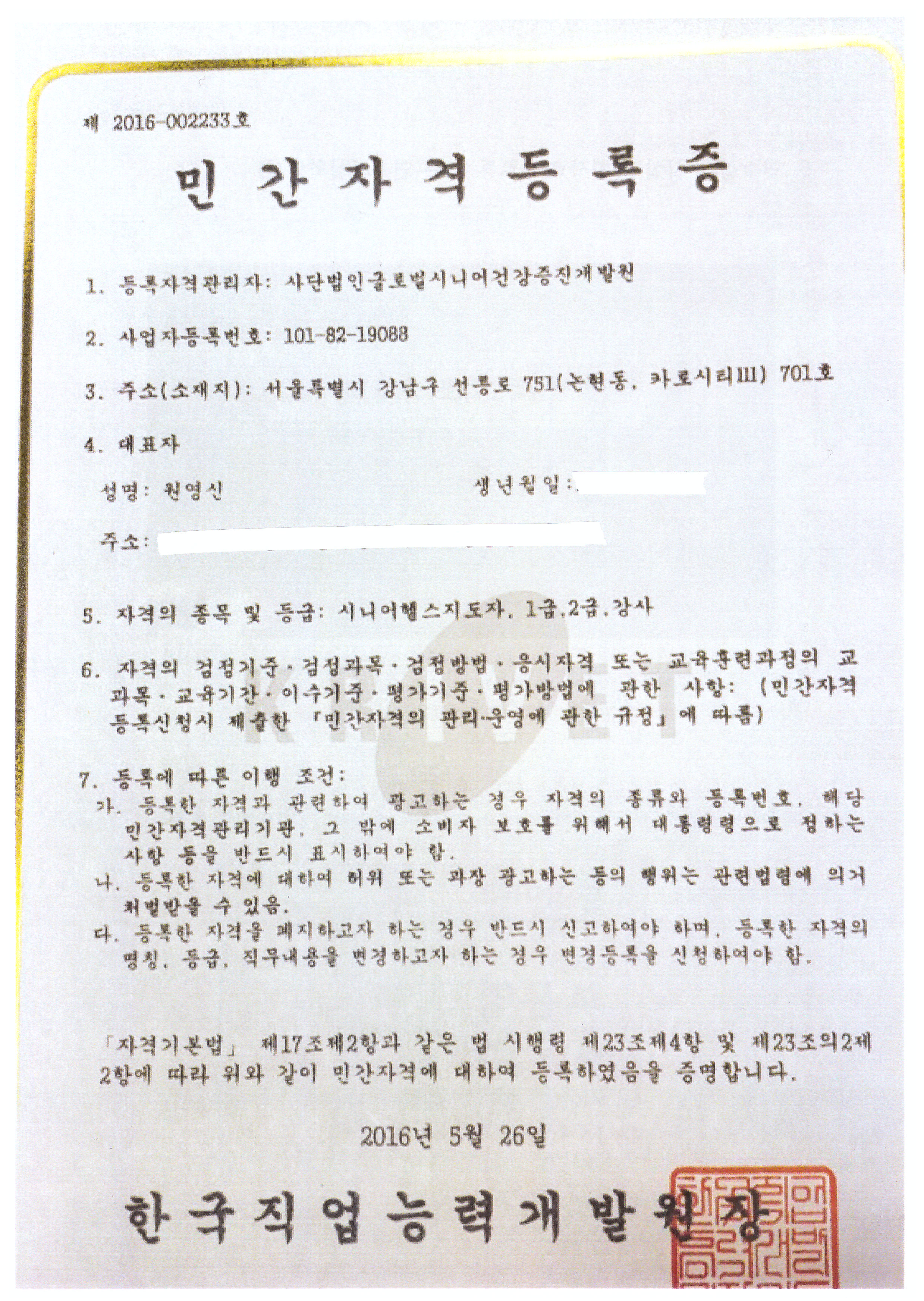 시니어헬스지도자 민간자격등록증