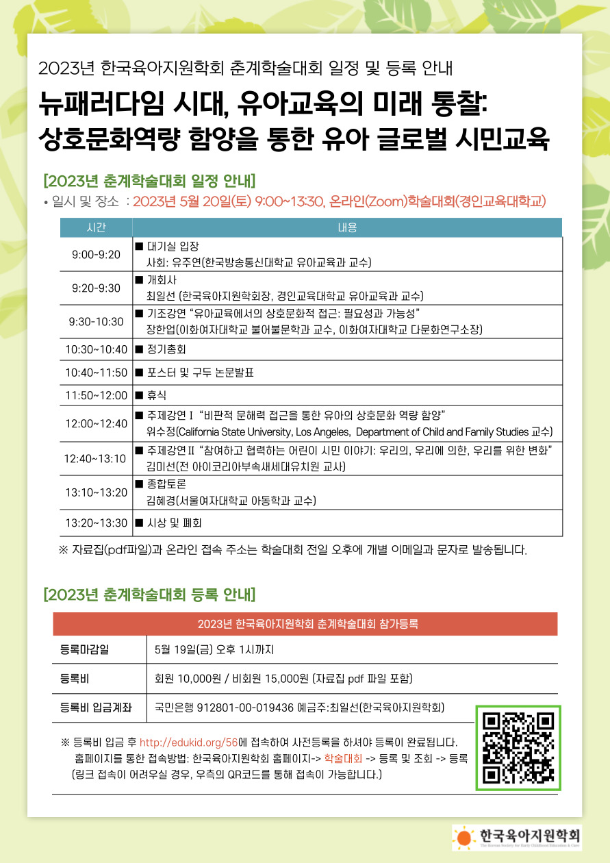 금번 춘계학술대회는 2023년 5월 20()에 뉴패러다임 시대유아교육의 미래 통찰상호문화역량 함양을 통한 유아 글로벌 시민교육이라는 대주제로 온라인(Zoom)학술대회(경인교육대학교)로 개최됩니다
