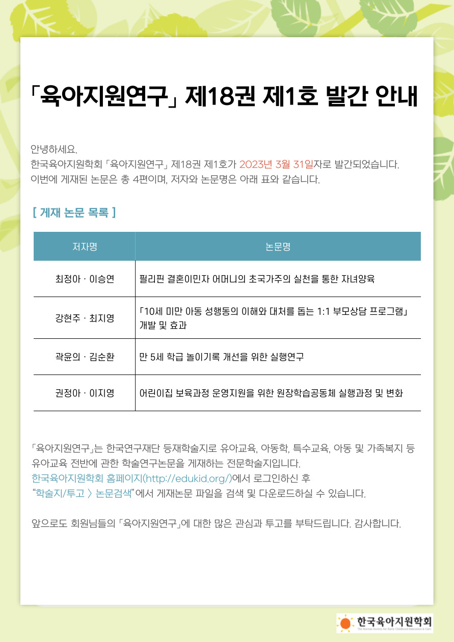 한국육아지원학회 「육아지원연구」 제18권 제1호가 2023년 3월 31일자로 발간(게재논문 4편)되었습니다.