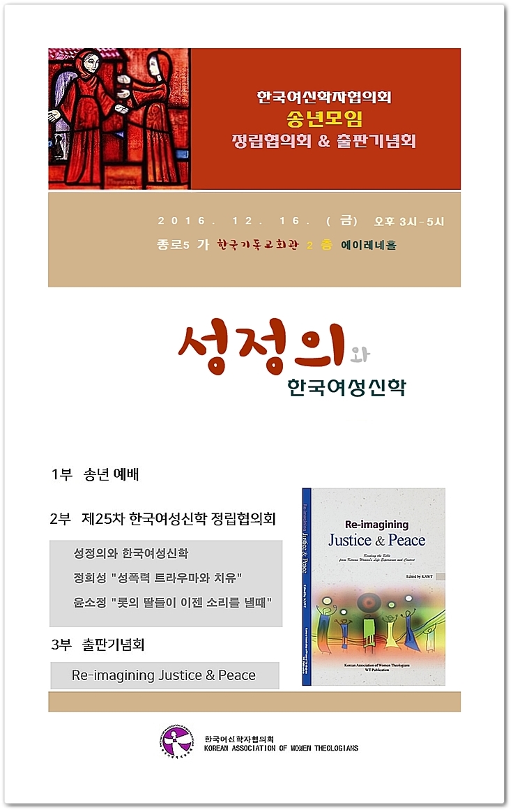 올해 여신협 12월 송년모임은 한국여성신학 정립협의회와 출판기념회를 겸하여 함께 진행합니다. 많이 오셔서 2016년 한해를 여성들의 기도와 토론, 나눔으로 마무리할 수 있기를 바랍니다.
