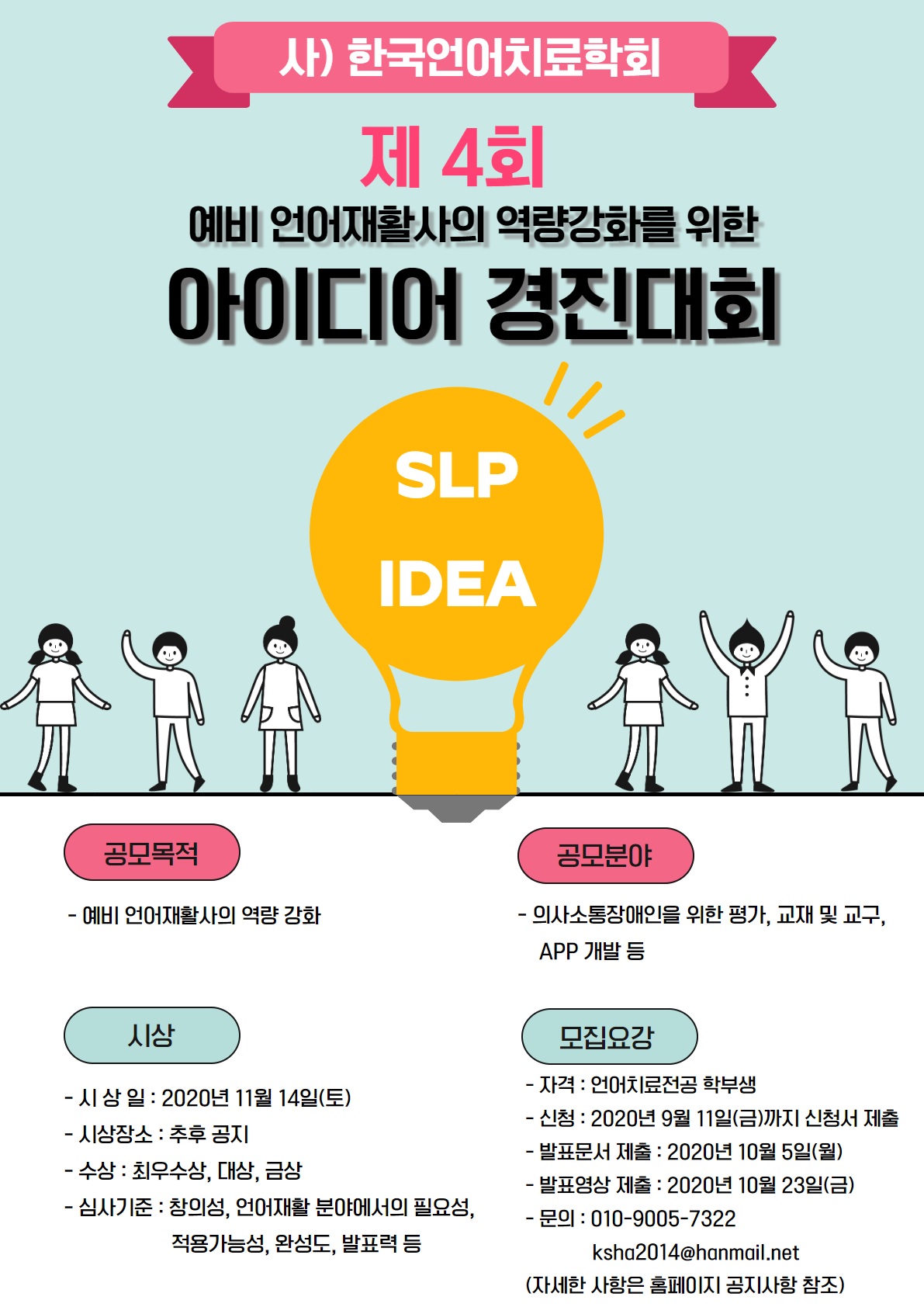 )한국언어치료학회에서 언어치료전공 재학생들을 대상으로 제 4회 아이디어 경진대회를 개최합니다.