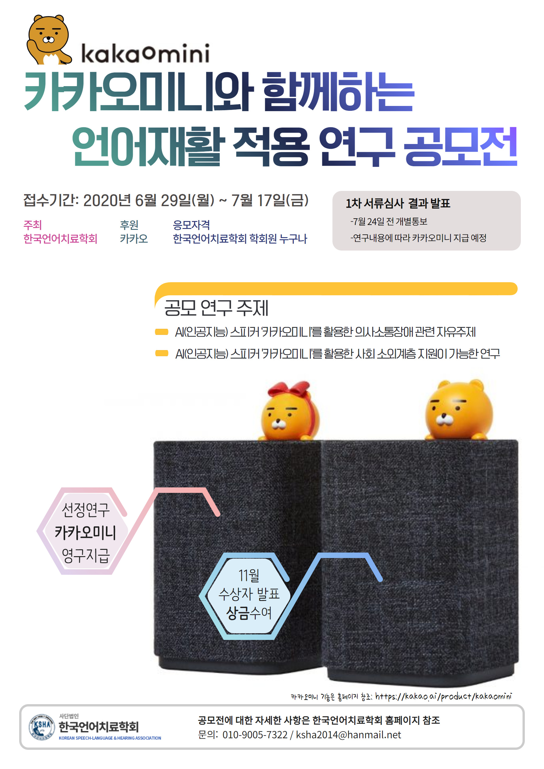 카카오 그룹(카카오미니)과 함께 인공지능(AI) 관련 연구 분위기 조성, 확산 및 의사소통장애인의 ‘삶의 복지’를 보다 효과적으로 지원할 수 있는 임상적 근거를 마련하고자 음성기반 시스템의 카카오미니 ‘인공지능스피커’를 이용한 공모전을 개최합니다.