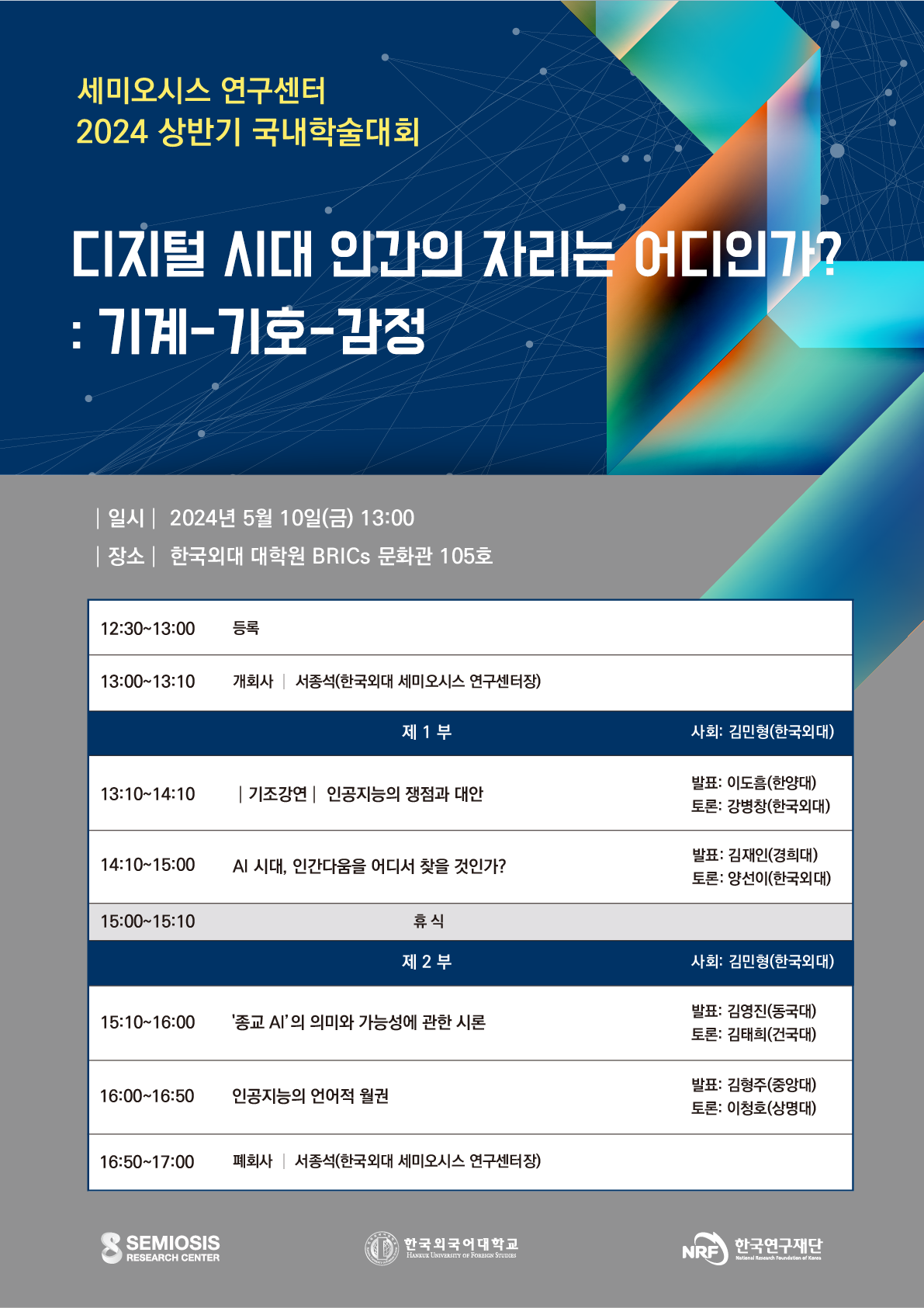 한국외국어대학교 세미오시스 연구센터(센터장 서종석)는 '디지털 시대 인간의 자리는 어디인가?: 기계-기호-감정'이라는 주제로 <2024 상반기 국내학술대회>를 오는 5월 10일(금), 한국외국어대학교 서울캠퍼스 대학원 BRICs 문화관 105호에서 개최합니다.