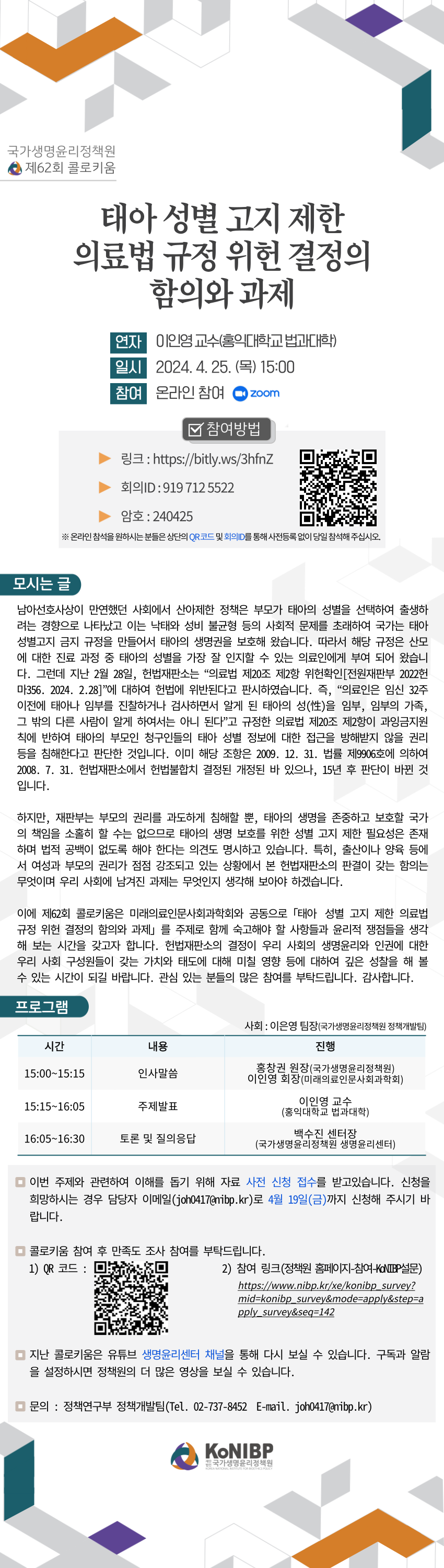 국가생명윤리정책원에서  4월 25일 목요일 15시에 제62회 콜로키움 「태아 성별 고지 제한 의료법 규정 위헌 결정의 함의와 과제」를 다음과 같이 개최하오니 많은 참여를 바랍니다 .
