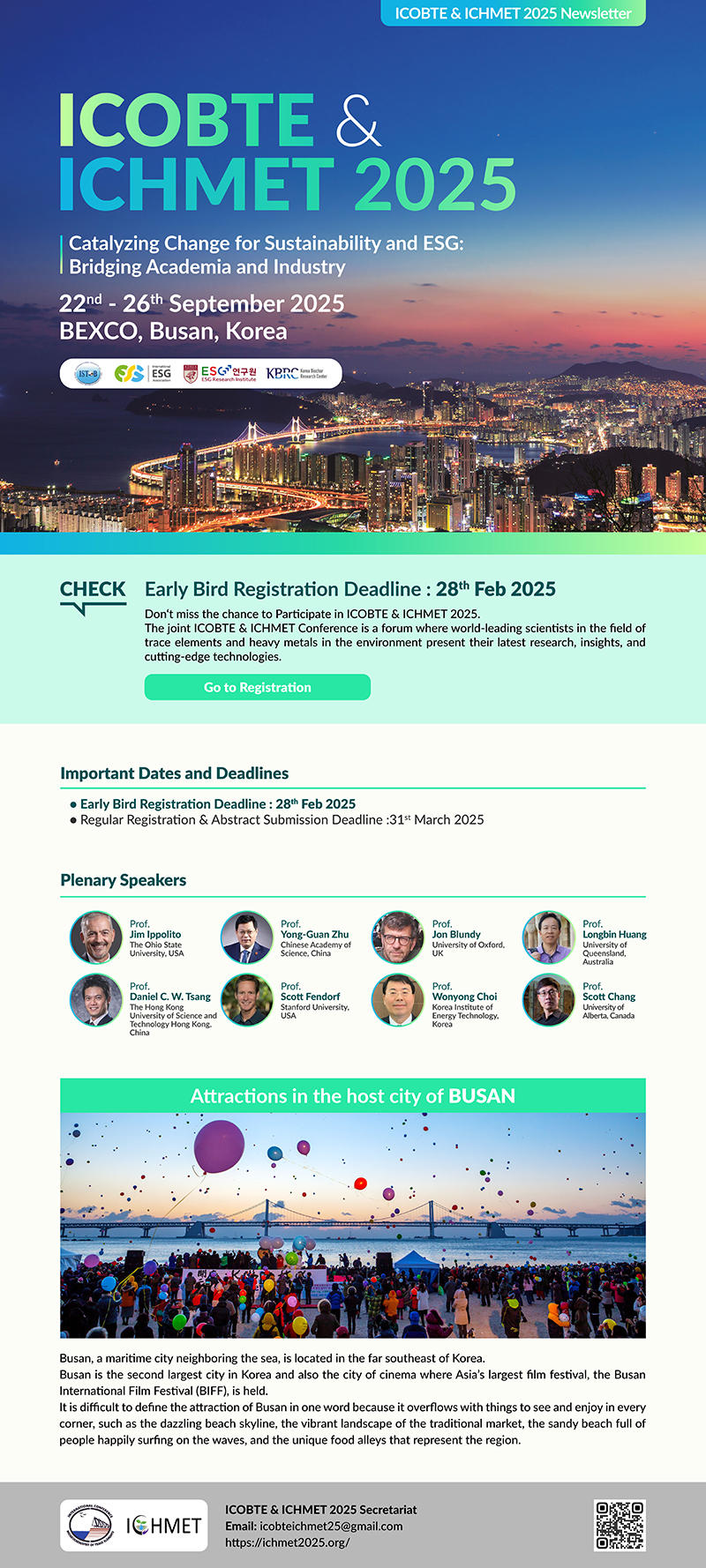 다가오는 2025년 9월 22일(월)부터 26일(금)까지 부산 벡스코(BEXCO)에서 미량원소 생지화학 분야의 세계 최대 국제학회인 ISTEB 주관으로 국제학술대회(ICOBTE) 및 환경 중 중금속 관련 국제학술대회(ICHMET)가 개최될 예정입니다.