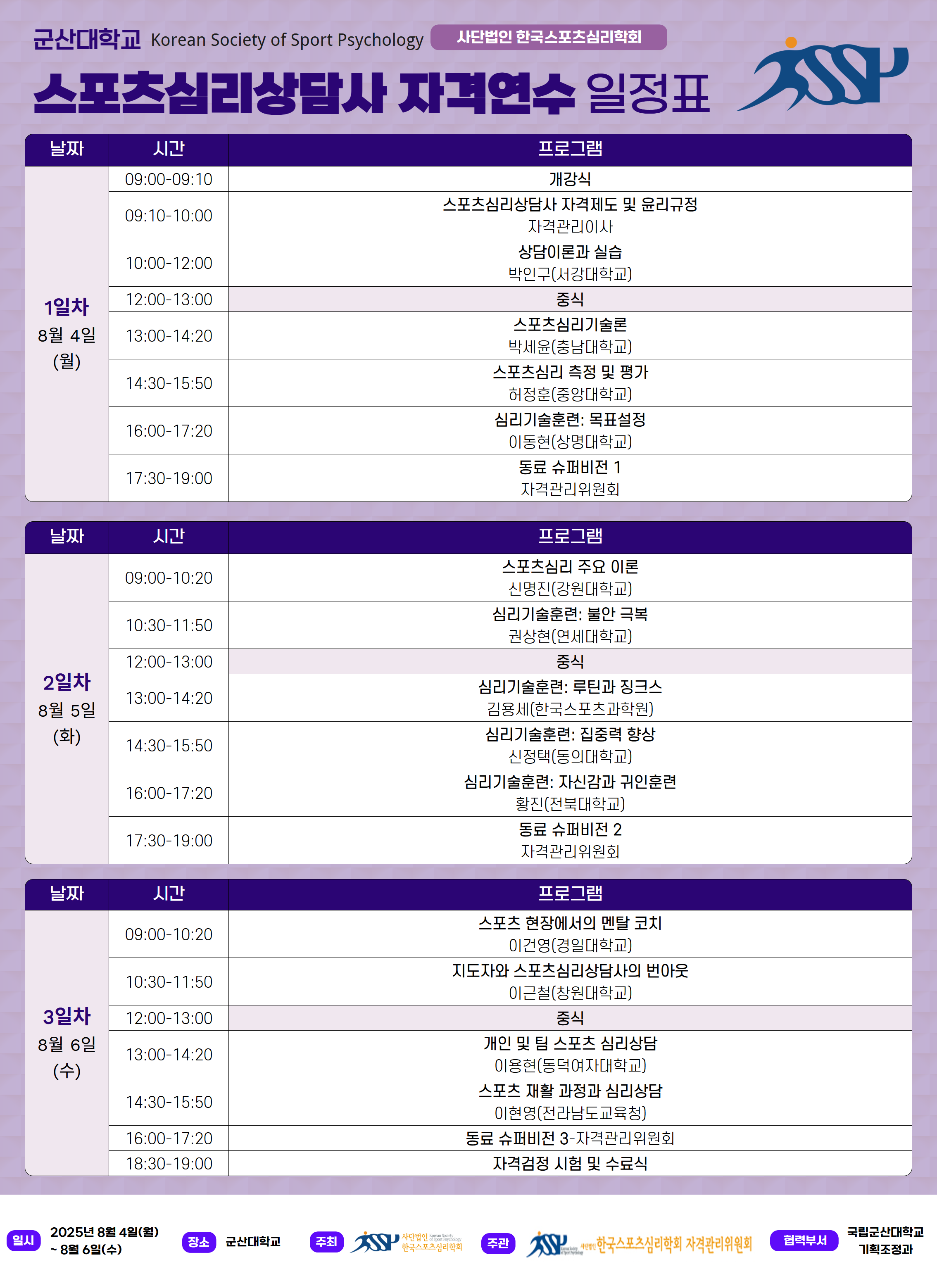 2025년 8월 국립군산대학교에서 진행되는 스포츠심리상담사 자격연수(3급) 최종 명단 및 연수 일정표를 공지하니 첨부 파일을 참고해주시기 바랍니다.